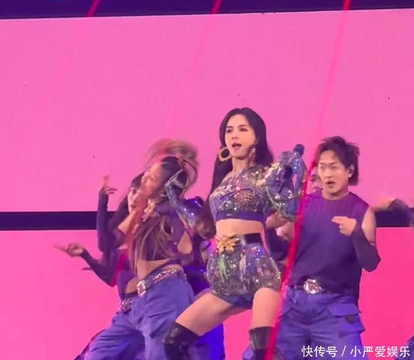 头发比过去长了不少。衣服也换了样子。演唱会上那身打扮,黑色上衣挂在脖子上,腰那儿露着一截。下面是短裤,配了双靴子,一直包到小腿。音乐响起来的时候,她跳得挺带劲。胳膊腿的动作幅度不小,旁边伴舞的都没她那么放得开。