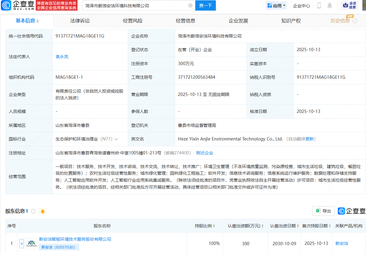 近日,菏泽市毅信安洁环境科技有限公司成立股票加杠杆在哪里加,法定代表人为袁永亮,经营范围包含:城市绿化管理;园林绿化工程施工;数据处理和存储支持服务;人工智能应用软件开发;人工智能行业应用系统集成服务等。企查查股权穿透显示,该公司由新安洁(920370)全资持股。